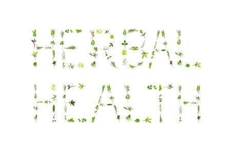 Large selection of herb leaf sprigs, spelling the words herbal health, over white background.