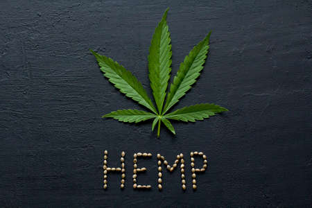 Green leaves and seeds of technical hemp lie on a black modern concrete background. Green background of leaves. Close-up young hemp. Green cannabis leaves, marijuana leaves. Copy space for your text.