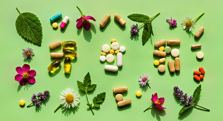 arrangement of natural pills and plants on white background