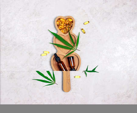 Bottles with Cannabis CBD oils Medical Marijuana plant leafs and Hemp seeds with letter dices