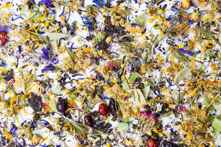 Top view of floral herbs - dried marigold, lavender, rose and cornflower petals as aromatic ingredients for cooking or tea