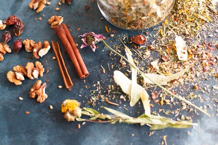 Cinnamon sticks, nuts and a herb collection scattered on a blue table, a glass jar with tea, lime, mint, lemon balm, chamomile. Daylight, horizontal image.