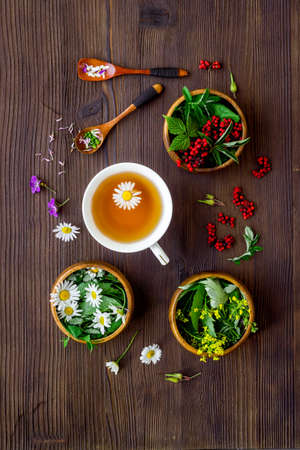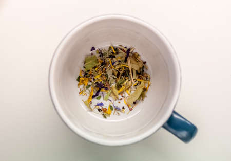Cup of herbal tea with wild herbs and wild flowers
