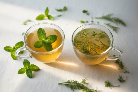 Two glass cups of herbal tea sit side by side on a white tablecloth. The left cup holds fresh mint leaves, while the right contains delicate sprigs of dill. Scattered herbs around the cups enhance the natural, fresh atmosphere.