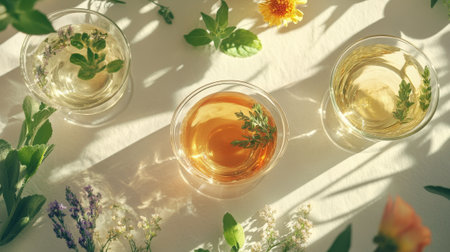 an array of herbal teas in pretty cups, creating a relaxing and detoxifying ambiance