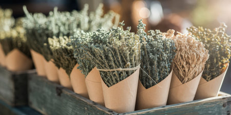 Dried herbs in paper cones displayed at a market.