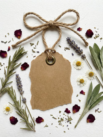 A charming rustic tag elegantly placed among an array of dried herbs and flowers, creating a natural and organic aesthetic perfect for crafting or labeling
