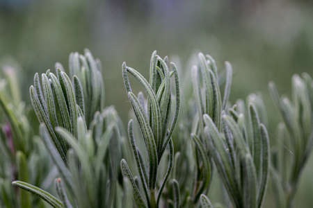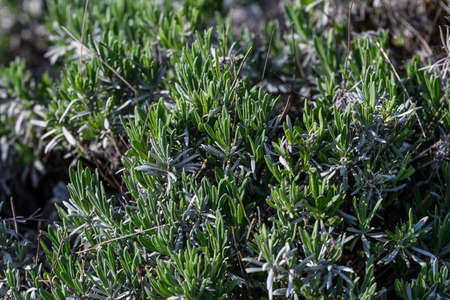 Close-up lavender seedlings growing in formal garden. Lavender plant with narrow green silver leaves, foliage. Perennial plants grow, care and seeding
