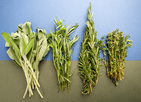 Fresh Rosemary, thyme, tarragon and sage on a light blue-green textured textured background.