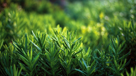 A panoramic wide view of Rosemary garden growing closely together at dawn gentle morning light illuminating fresh leaves ultra realistic photography cinematic wide composition lifelike natural scene