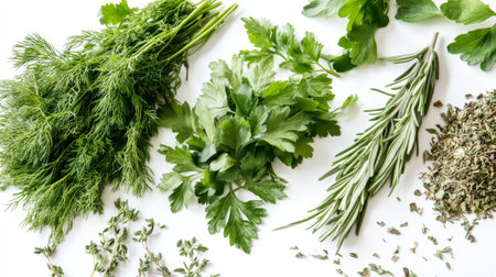 A detailed view of fresh herbs like cilantro and dill alongside dried herbs like rosemary and sage on a white background.
