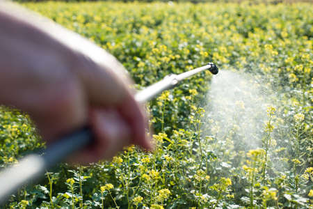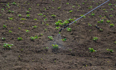 Weed killer herbicide glyphosate spraying. Non-organic vegetables.