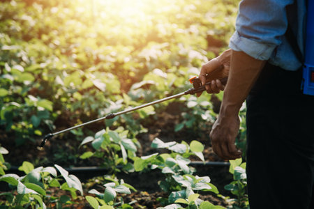 A man sprinkles potatoes from the Colorado potato beetle. selective focus. Nature.