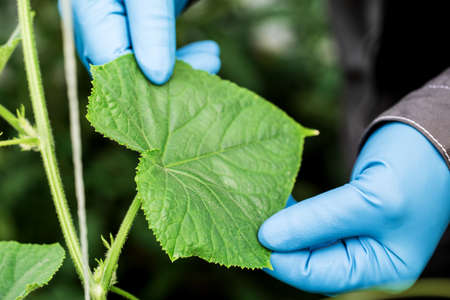 Close-up of hand in a white glove holding withering leaf of tomato plant covered with drops of complex drug against pests and diseases.