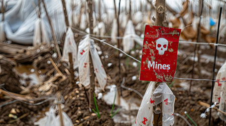 A rustic wooden sign with a skull and the words danger mines carved into it. The font is bold and eyecatching, warning of potential hazards in the area