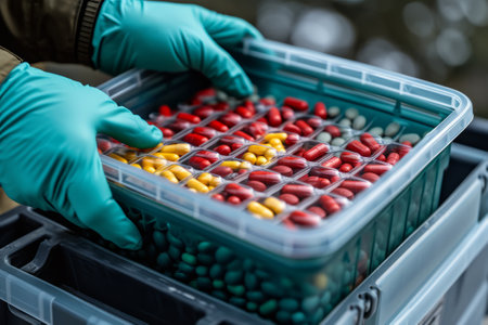 Injection for quick ripening tomato. Female biologist in blue gloves holds a syringe, close up. Genetically modified non organic food concept.