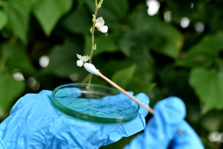 Agriculture and plant improvement analysis, Scientist collecting pollen grains, Technician doing hand pollination to create various species.