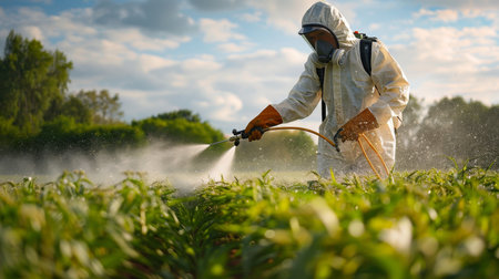 Scientist in hazmat suit spraying pesticides on agricultural field at sunset