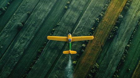 airplane spraying over vast agricultural fields, offering a symmetrical and expansive view of largescale plantation operations