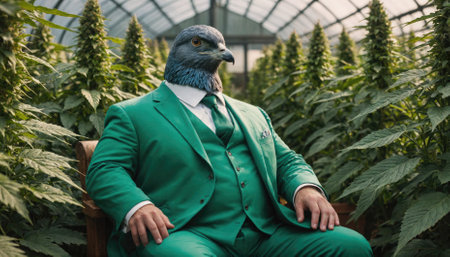 A pigeon wearing a green suit sits amongst cannabis plants in a greenhouse