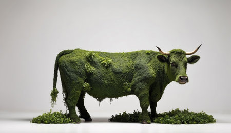 A cow covered in lush green leaves and grass as a symbol of ecological concept