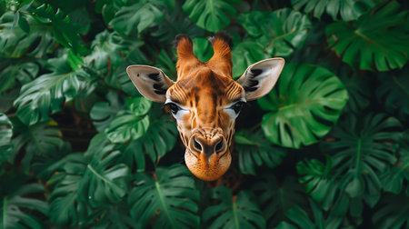 Giraffe head in the jungle with leaf background, top view
