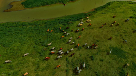 Aerial photography ducumentary Herd of cows grazing on the meadow near the lake at sunset