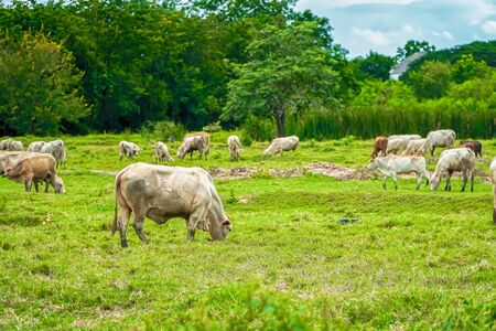 Cow is eating grass in a cow farm in Thailand.
