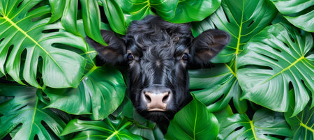 Majestic yak gazing from dense tropical jungle foliage depths, a glimpse of the wild wilderness