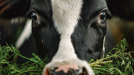 A close-up of a cow's mouth chewing fresh grass, with tiny details of its tongue, teeth, and saliva captured in sharp focus.