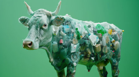 An AI generated illustration of a cow made from plastic materials, a concept of environmental problems