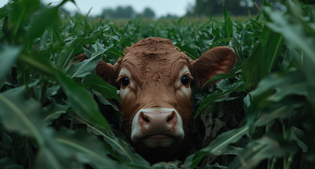 Close-up of a curious calf peeking from a cornfield