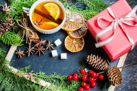 Cup of Tea with a Lemon and Cinnamon on Christmas Background. Rustic style