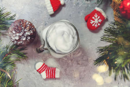 Christmas white drink eggnog in glass mug on gray background with spruce branches and handmade decorative knitted ornaments sock, hat, mitten top view