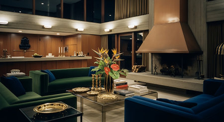 Interior design of Living Room in Contemporary style with Fireplace decorated with Velvet, Wood, Leather material. Modern architecture. Generative AI AIG24.