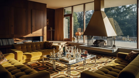 Interior design of Living Room in Modern style with Fireplace decorated with Plush Rug, Velvet Sofa material. Contemporary architecture. Generative AI AIG24.