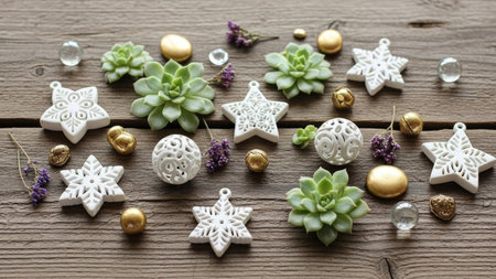 A flat lay image captures a mix of decorative elements arranged on a rustic, weathered wooden surface. The composition includes several white ceramic ornaments, some shaped like five-pointed stars and others like snowflakes. These ornaments have intricate patterns engraved on their surfaces. Interspersed among the white ornaments are vibrant green succulent plants, creating a natural contrast. Small decorative elements, such as gold-colored spheres, tiny gold bells, clear glass marbles, and sprigs of dried purple flowers, fill the spaces between the larger items. The high-angle perspective emphasizes the texture of the wooden background and creates a visually appealing still life arrangement, suitable for holiday or craft-related themes.