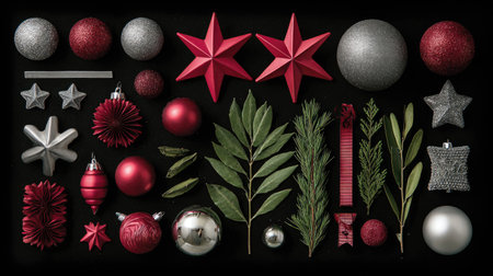 A vibrant collection of holiday decorations featuring red and silver ornaments, leaves, and stars arranged beautifully against a black background, ideal for Christmas themes.