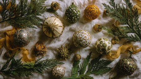 Discover an exquisite arrangement of elegant Christmas ornaments amidst lush greenery, creating a cozy and festive atmosphere perfect for holiday decorations.