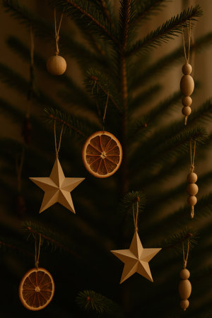 Cozy close up of fir tree branches decorated with wooden beads paper stars and dried orange slices in warm moody light.