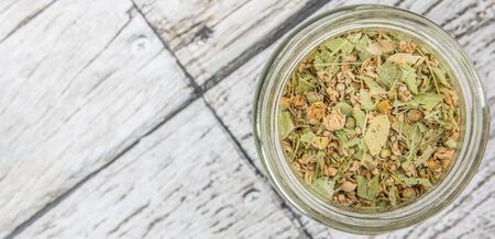 Herbal tea leaves prepared for a cooking in a white plate on a wooden background