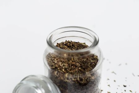 a row of glass jars with different spices and herbs inside them on a white background.igh resolution AI generated