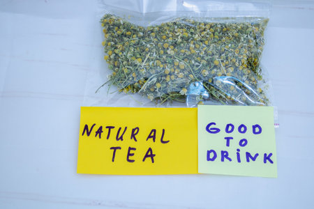 Bag of natural dried chamomile tea with handwritten notes on white background promoting healthy drink.