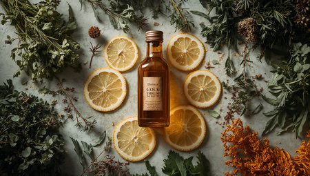 Modern flat lay style showcasing herbal medicine and cosmetic background