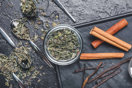 Various jars filled with herbs and spices are displayed on a dark textured surface showcasing a culinary arrangement for cooking.