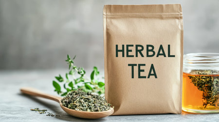 Dried Herbal Tea Leaves in Paper Packaging with Wooden Spoon, Promoting Natural Wellness Concept.