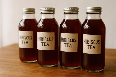 Glass bottles filled with fresh hibiscus tea arranged in a row on a wooden table in natural daylight.