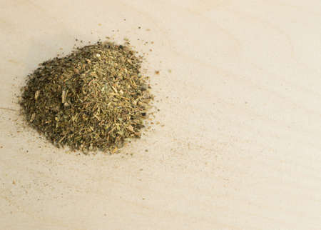 Heap of Dried Basil Flakes Over Rustic Wooden Background with Copy Space