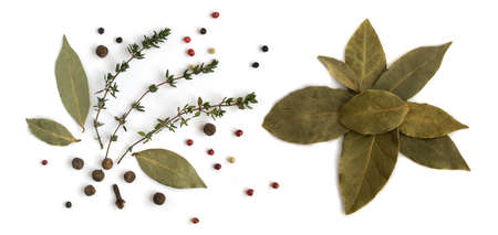 Group of Dry Spices with Thyme and Bay Leaves Isolated on White Background Top View