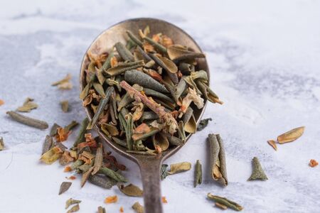 Rhododendron of Adamsia in a spoon on a white background. Dry medicinal tea leaves